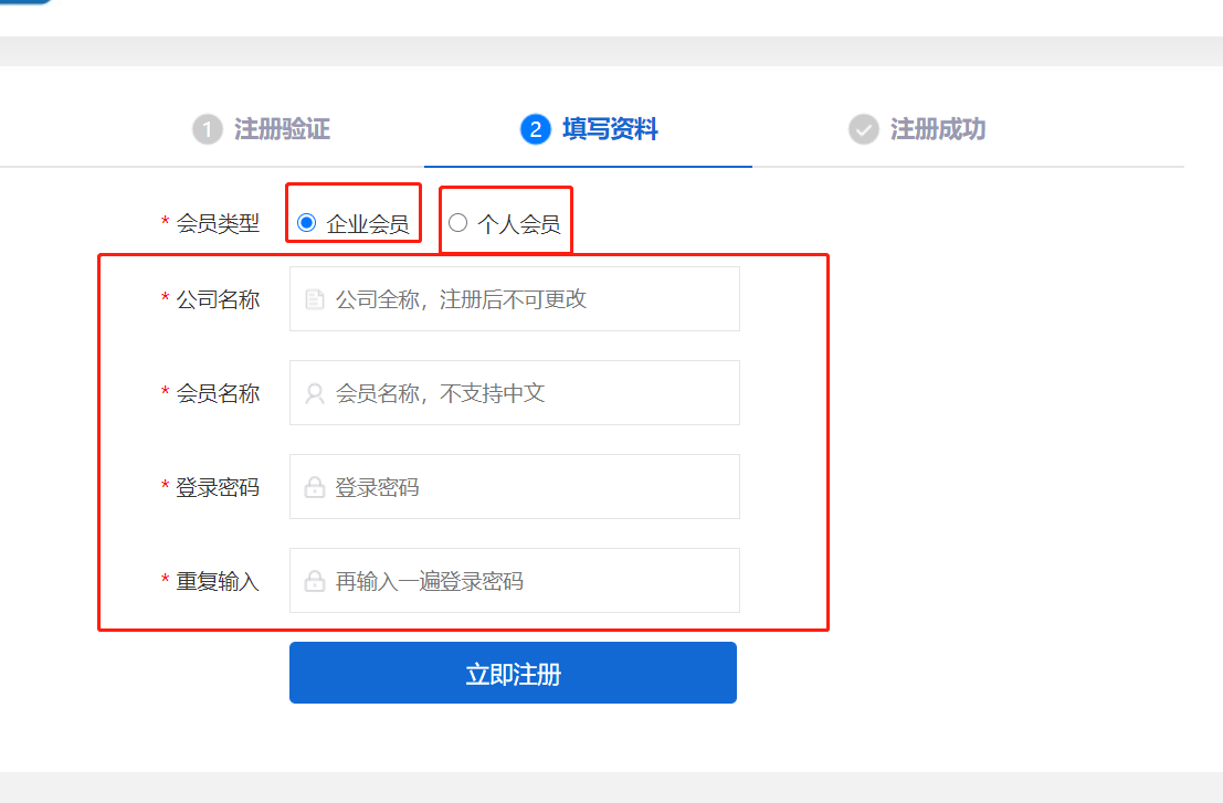 3.根據(jù)定位選擇注冊(cè)會(huì)員類型(企業(yè)/個(gè)人)并填寫基礎(chǔ)信息