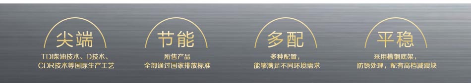 (TDI柴油技術、D技術、 CDR技術等國際生產(chǎn)工藝)、節(jié)能(所售產(chǎn)品 全部通過 排放標準)、多配(多種配置, 能夠滿足不同環(huán)境需求)、平穩(wěn)(采用槽鋼底架, 防銹處理,配有 減震塊 )