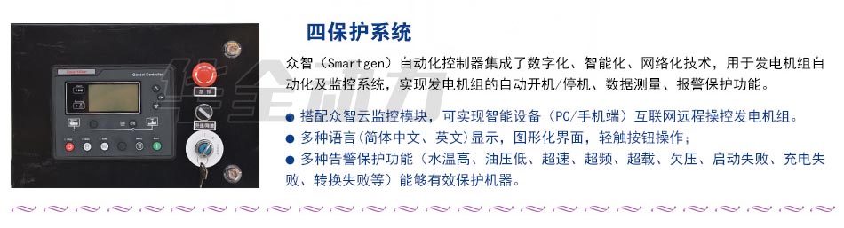 四保護(hù)系統(tǒng) 眾智(Smartgen)自動化控制器集成了數(shù)字化、智能化、網(wǎng)絡(luò)化技術(shù),用于發(fā)電機(jī)組自動化及監(jiān)控系統(tǒng),實(shí)現(xiàn)發(fā)電機(jī)組的自動開機(jī)/停機(jī)、數(shù)據(jù)測量、報(bào)警保護(hù)功能。