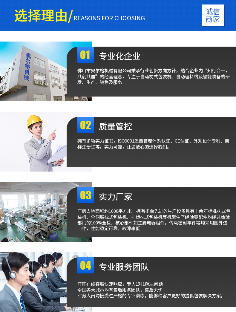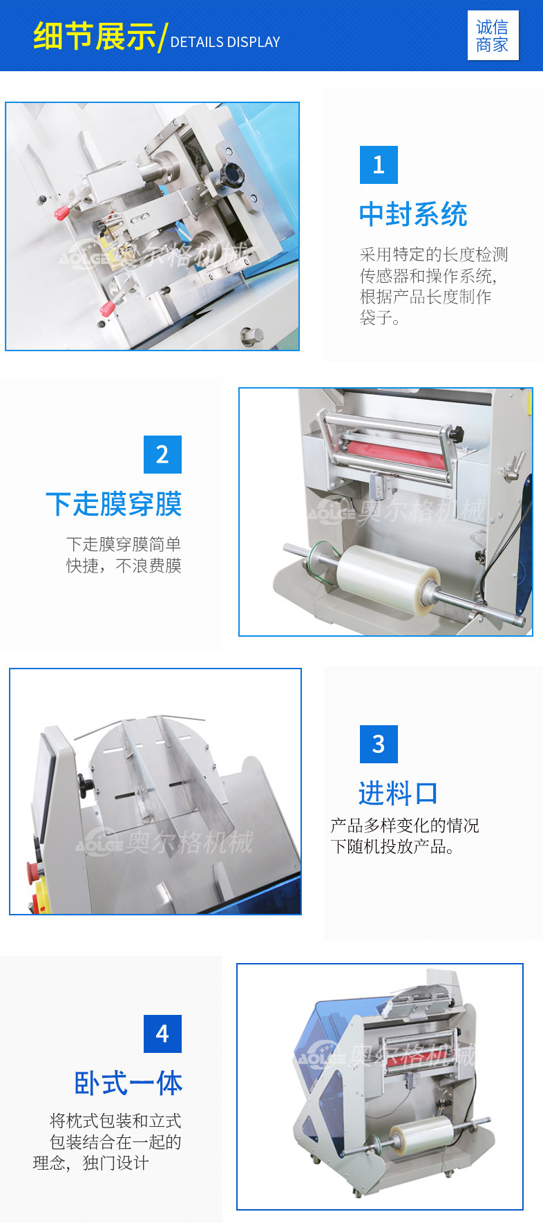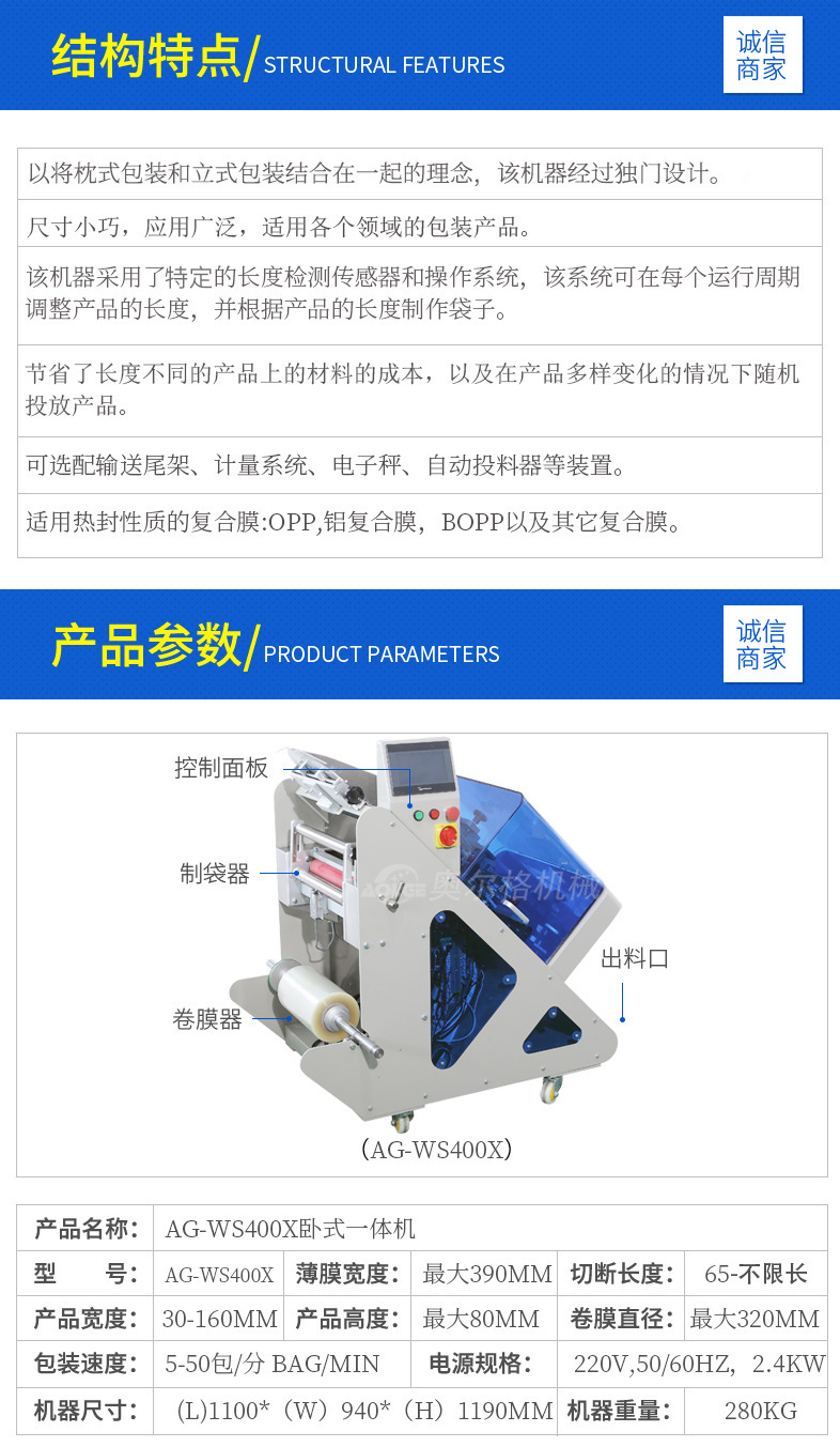 詳細信息 訂貨號AG-WS400X 加工定制是 貨號AG-WS400X 功能打包,封口,充填,集裝,包裝輔助,打碼、噴碼,條碼識別、打印,裹包 品牌AOLGE 型號AG-WS400X 電壓220(V) 功率2.4(Kw) 包裝膜寬最大390(mm) 制成袋尺寸65mm-不限長(mm) 包裝速度5-50(袋/分鐘) 重量約280(kg)