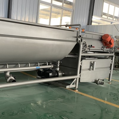 該機(jī)組由旋流式清洗機(jī)和振動(dòng)瀝水機(jī)組成旋流槽采用不銹鋼板卷制而成,槽體進(jìn)口處及兩側(cè)配有噴沖管,經(jīng)高壓水泵供水,經(jīng)噴沖管作用在噴沖水的作用下是槽體內(nèi)的水產(chǎn)生回旋狀態(tài)物料經(jīng)水流作用旋轉(zhuǎn)向前推進(jìn),完成清洗,并將物料輸送振動(dòng)瀝水裝置中,水流經(jīng)振動(dòng)篩的孔板流入底部水箱中完成整個(gè)水路的循環(huán)。物料則經(jīng)過(guò)振動(dòng)作用輸送到工序,至此本裝置完成一次工作。