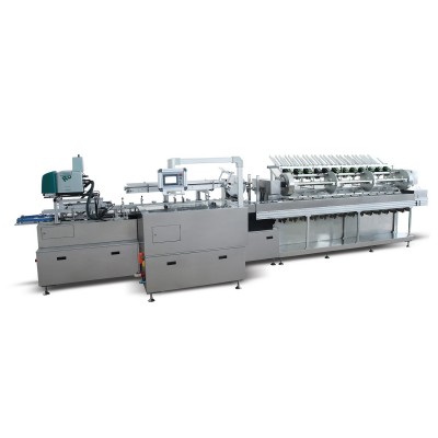 智能型、連續式全自動化妝品裝盒機裝盒專用設備,最高速度達100盒/分。適用于膏貼、面膜、眼貼、薄片包裝等行業。(該機的吸盒方式采用轉盤式)